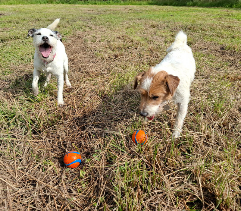 The first walk of the day is followed by a check and clean of the kennels, then breakfast and time to relax in the kennel or outdoors run. Mid morning brings a further kennels and welfare check, and the second walk of the day – either ball-play in the paddock or a walk through the woods and field. The dogs have access to the covered outdoor area of their kennel all day, unless it’s particularly cold when we may close down the hatches to keep them warm and cosy inside. We live on site so are able to pop in at any time to calm any guests who may be feeling anxious or need a little extra attention.